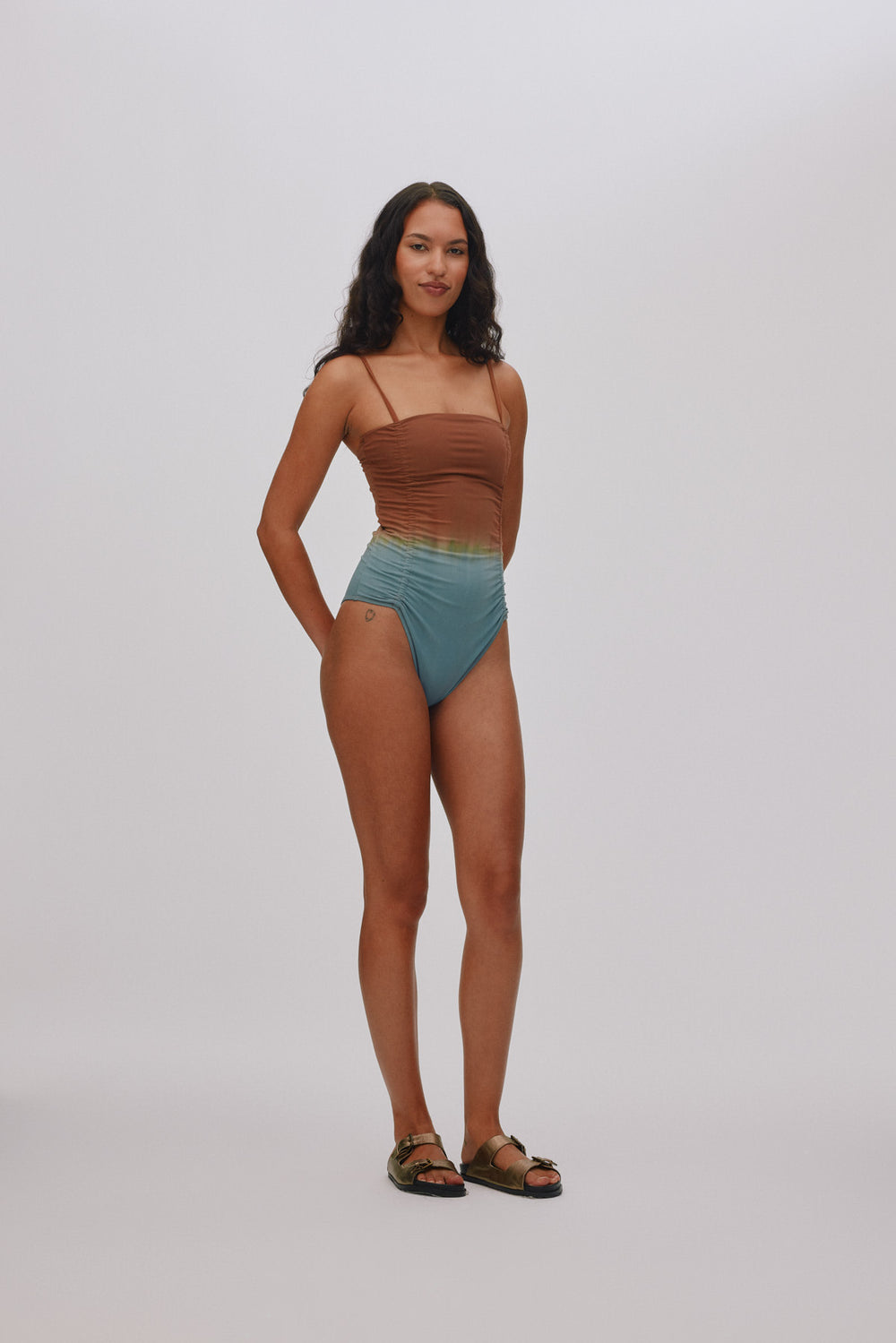 Denne raffinerede badedragt skiller sig ud med et håndfarvet tie-dye-mønster, der gør hvert produkt helt unikt i farver og udtryk.