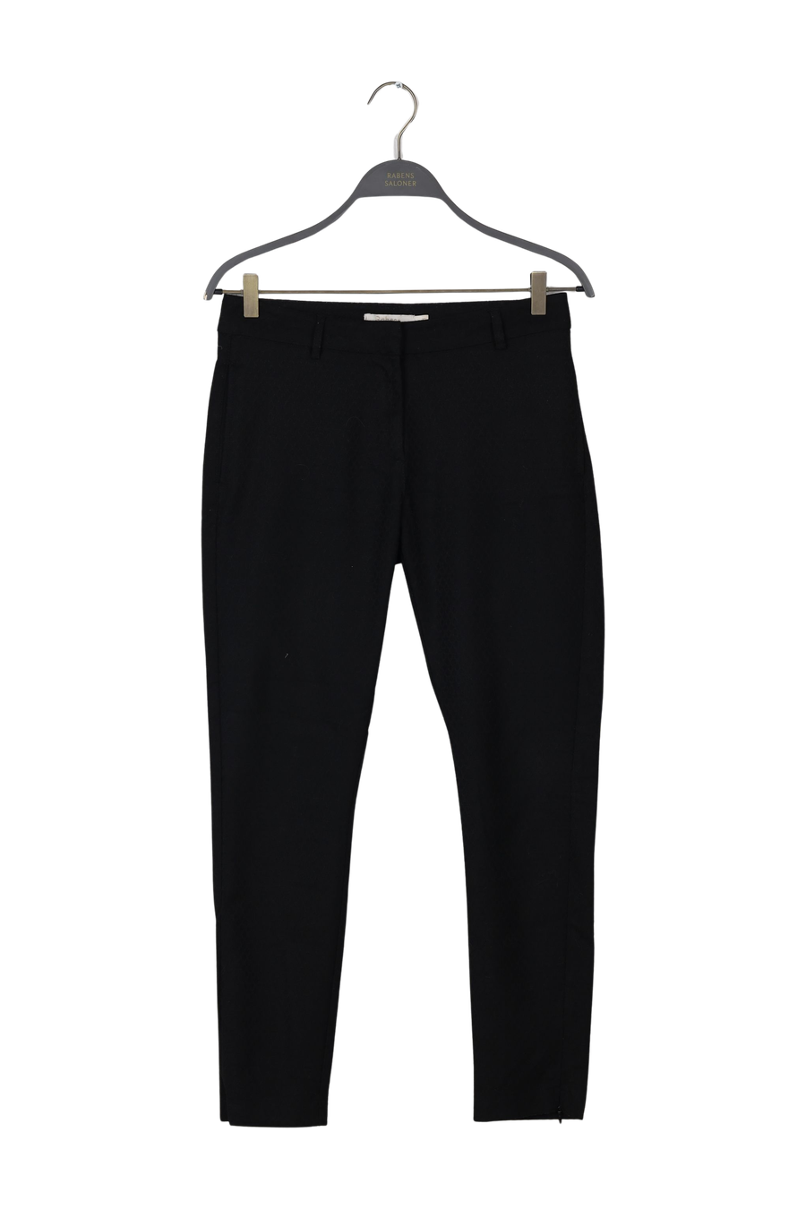 Cigaretbukser med lige ben. Detaljeret med diskrete lynlåse ved anklerne. Normal talje med lynlåslukning og bæltestropper.