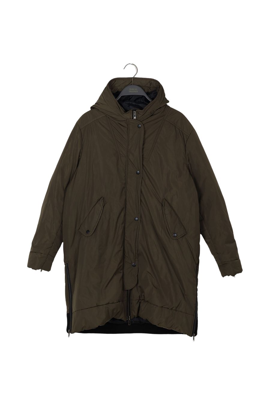 Crafted in Turkey, the green puff coat is made of padded polyester with thermal insulation resisting migration and fast drying. It is designed with a zipper closure with buttons, zipper cuffs, side pockets and a hood in a soft, breathable material.