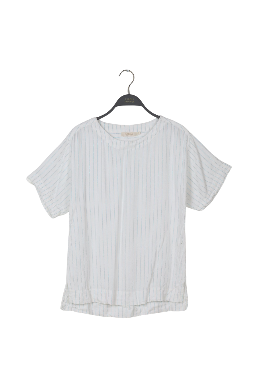 Belted blouse with light copper stripes.