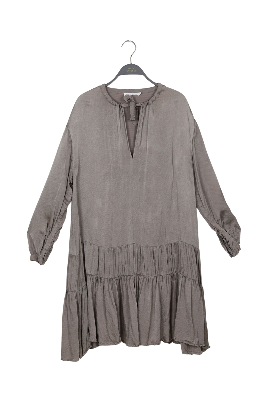 Kjolen er lavet af et let og behageligt materiale, der giver et flot fald. Den har en afslappet, løstsiddende silhuet med en flagrende nederdel, lange ærmer med knapper og en rund halsudskæring med justerbart bindebånd.