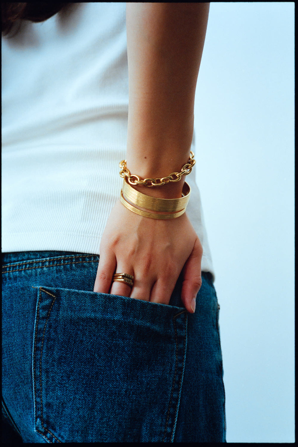Som den mellemste i en serie på tre stabelbare ringe med forskellige højder, er ringen skabt til at blive kombineret med de andre ringe for et personligt og skulpturelt udtryk.