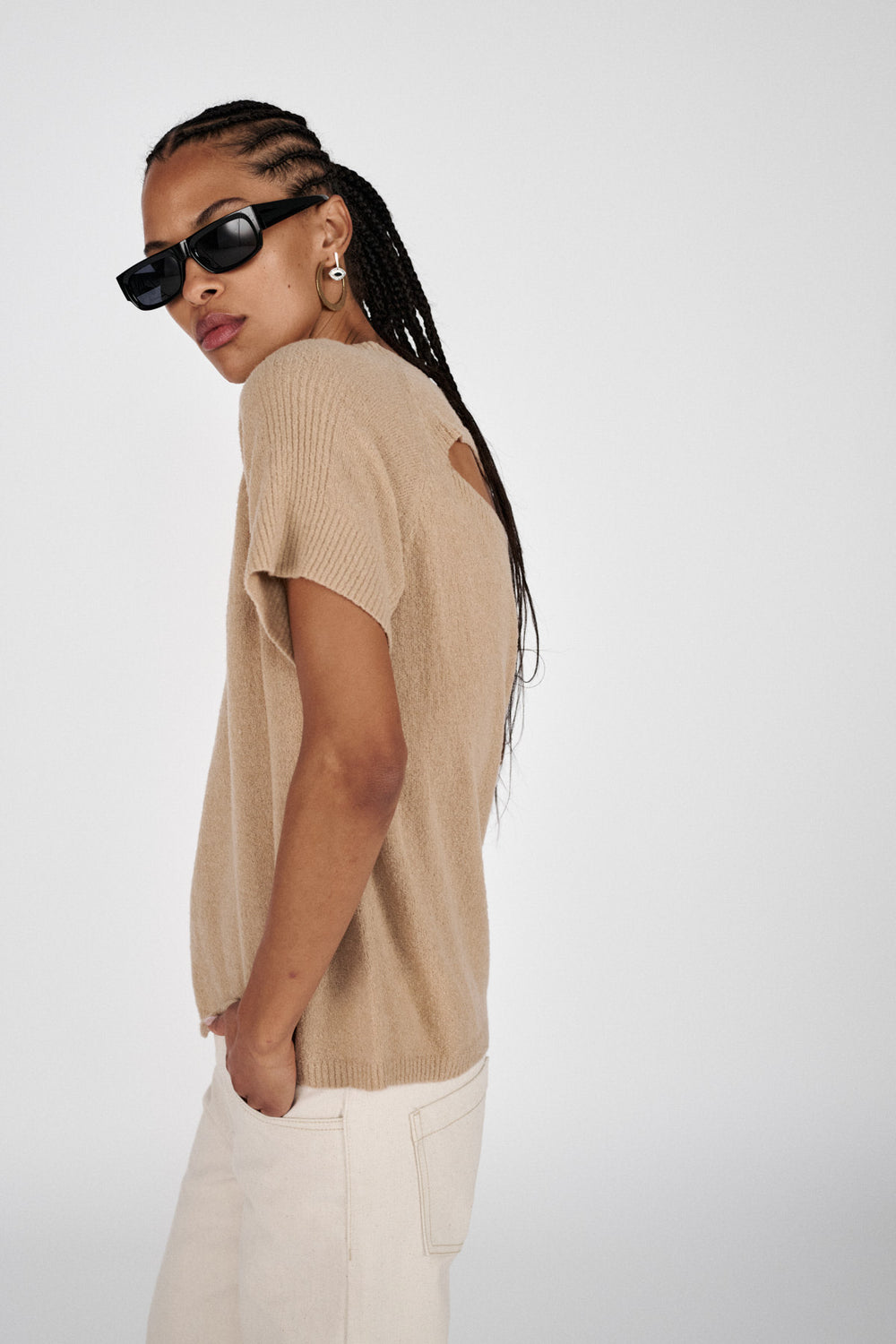 Designet har en afslappet pasform med korte ærmer, ribkantet rund hals og ribstrikkede manchetter og kanter. Den skiller sig ud med en elegant åben ryg, der giver kant til det klassiske item.
