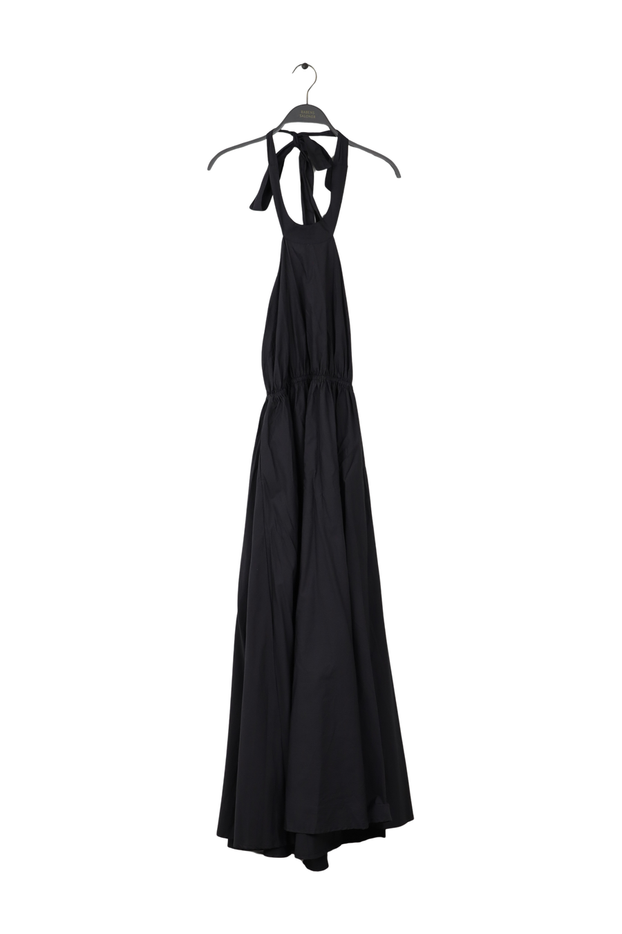 Den lange kjole er karakteriseret af en oversized pasform, der skiller sig ud med et dragende asymmetriske snit med rynkede detaljer. Den har bådhals med mellembrede stropper.